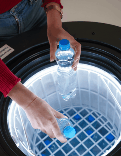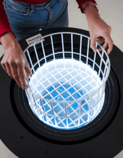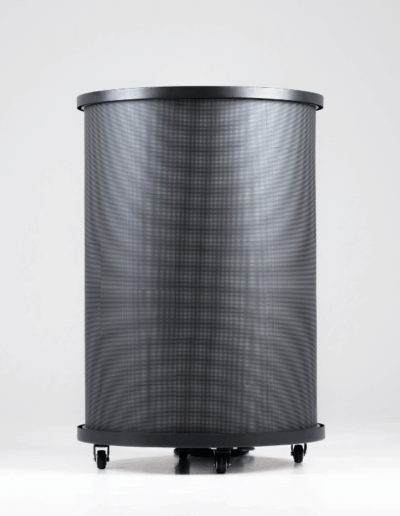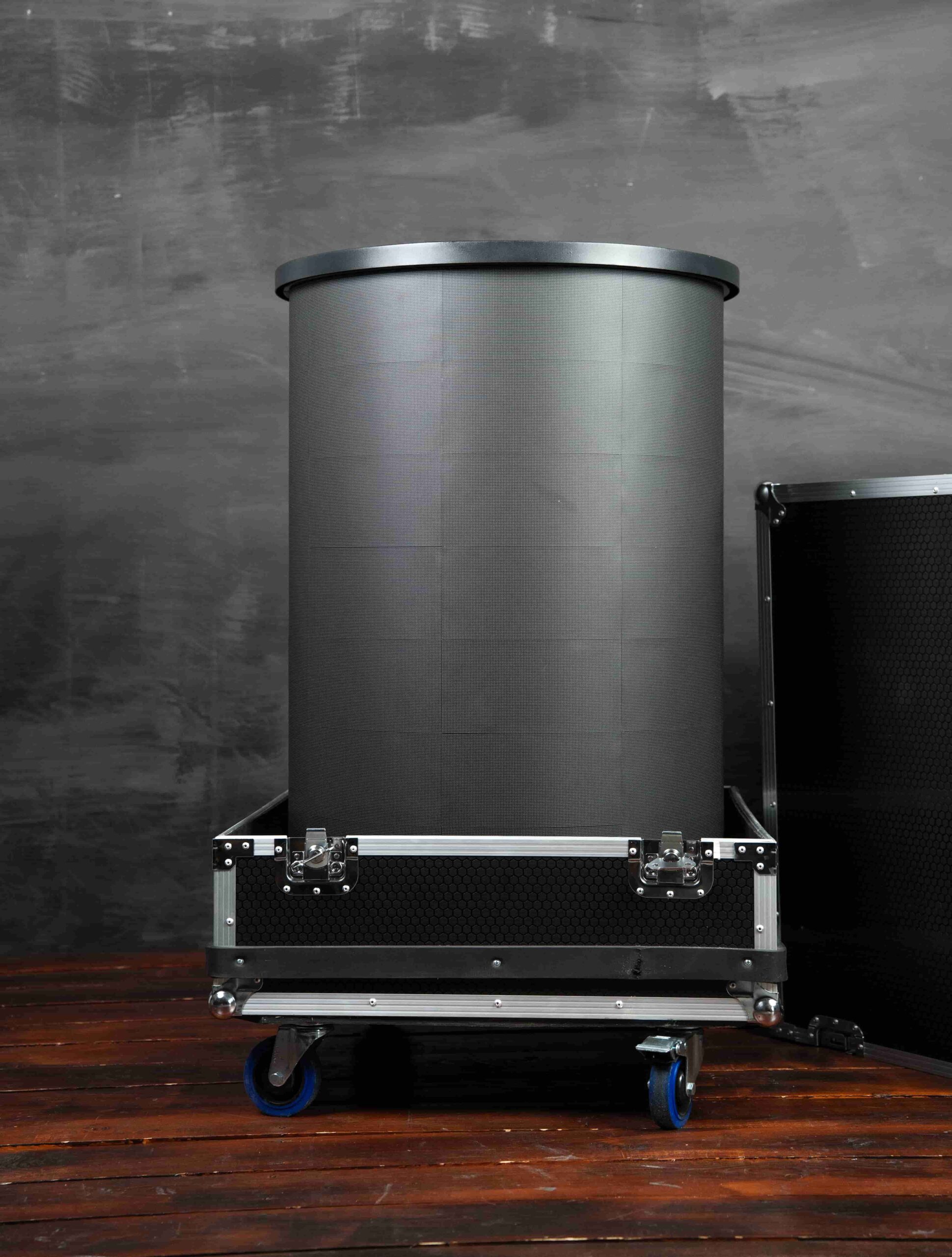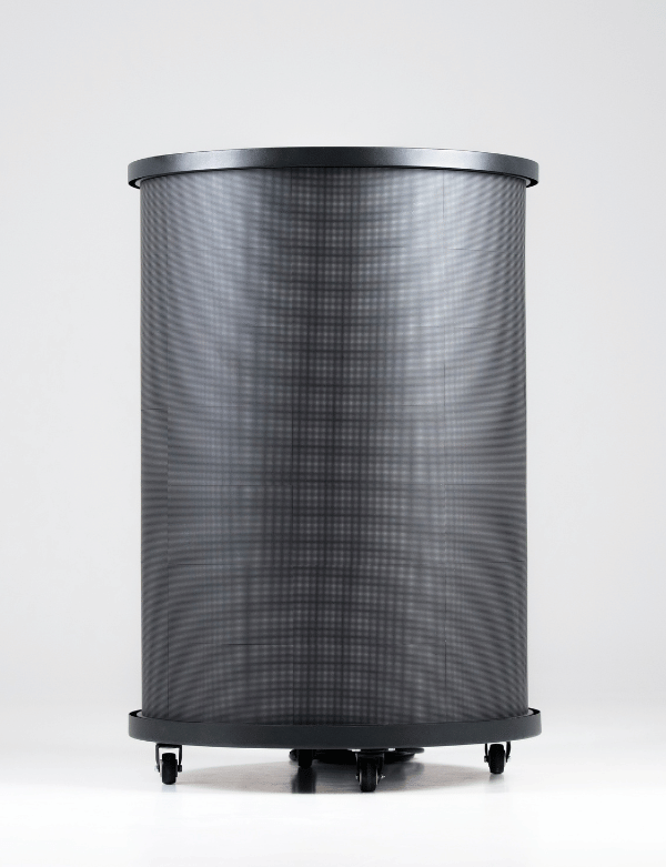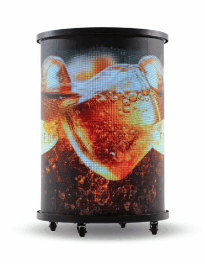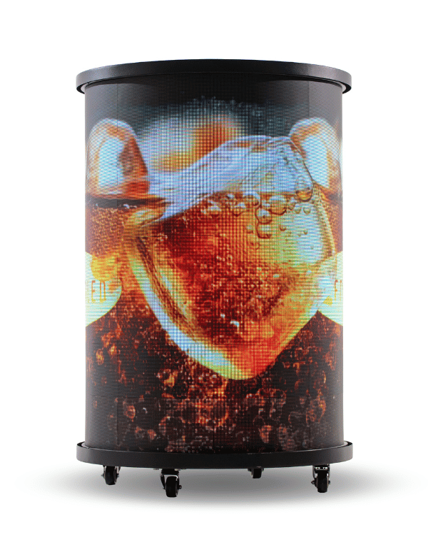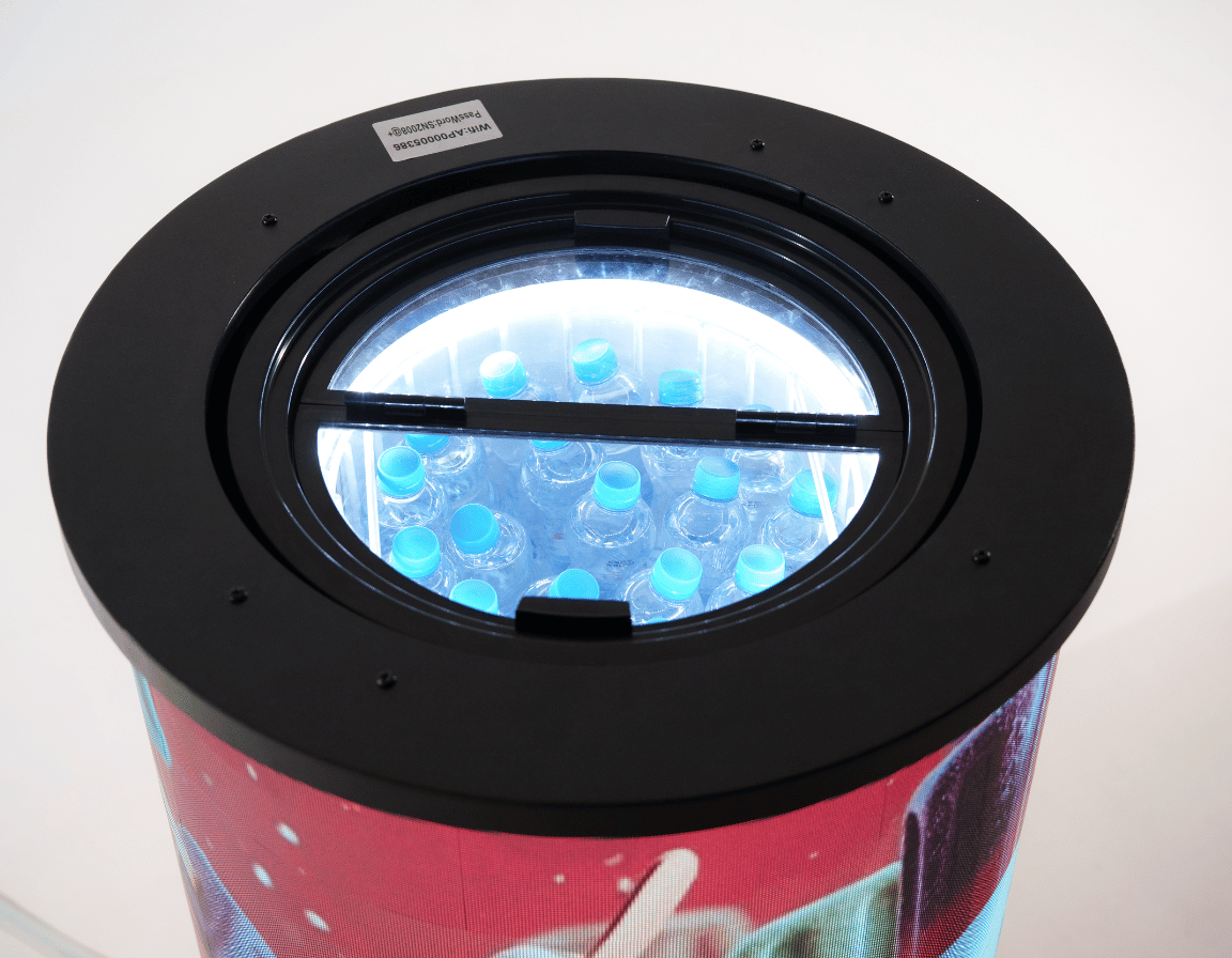 A FrigoLED egy kompakt, henger alakú hűtőszekrény, amelynek teljes külső felületét megszakítás nélküli, 360°-os LED-kijelző borítja.